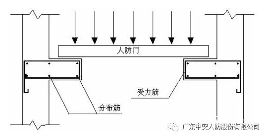 当防护密闭门在竖井边且其正上方无遮挡物时,也应设置一根突出墙面l00mm、高为200mm的梁,与柱子组成门套。柱子与梁的箍筋锚固长度为墙板的厚度(图九)。悬板活门、胶管活门应嵌入墙内,嵌入墙体的深度由设计定。