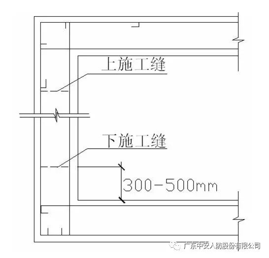 现象:施工缝留置错误,造成工程渗水。分析:人防工程施工缝是渗水的重要通道,要尽量避免施工缝的数量,外墙施工缝留置要遵循以下原则:一般在一个浇筑区段内不宜再留竖向施工缝。水平施工缝一般设两道,一道在底板以上300-500mm处,不得将施工缝留在外墙与底板交接处,另一道留在外墙上端,在插入墙内的顶板负弯矩钢筋的端头之下(图十五)。